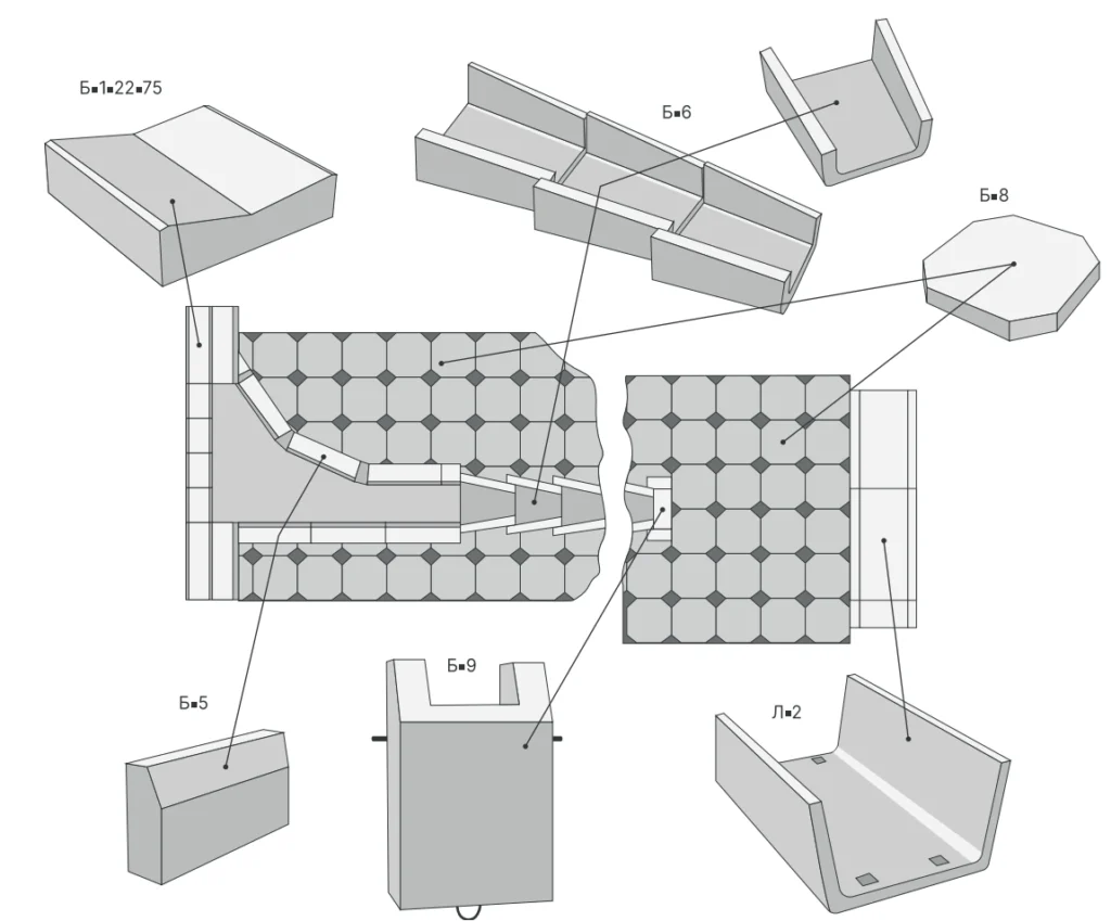 Залізобетонні лотки та блоки для водовідведення виготовлені з важкого бетону в металоформах за допомогою стендової технології. Вироби для водовідвідних споруд поділяють на категорії залежно від виконуваних функцій: водопропускні, каналізаційні, зливні, прикромочні, дренажні. Вони мають тривалий термін експлуатації, витривалість,невибагливість в обслуговуванні, простоту та надійність в експлуатації.