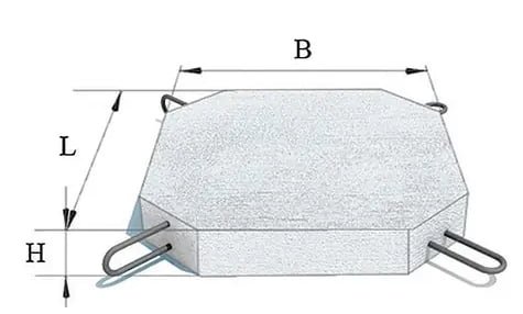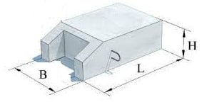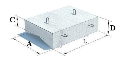 | Найменування | A, мм | B, мм | C, мм | L, мм | Клас бетону | Об’єм виробу, м³ | Вага, т |